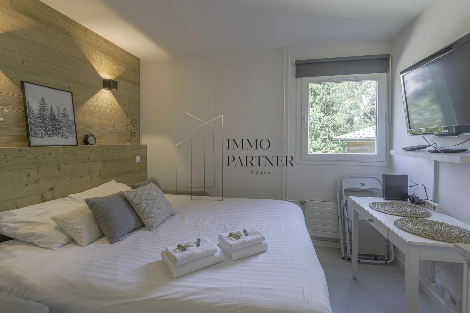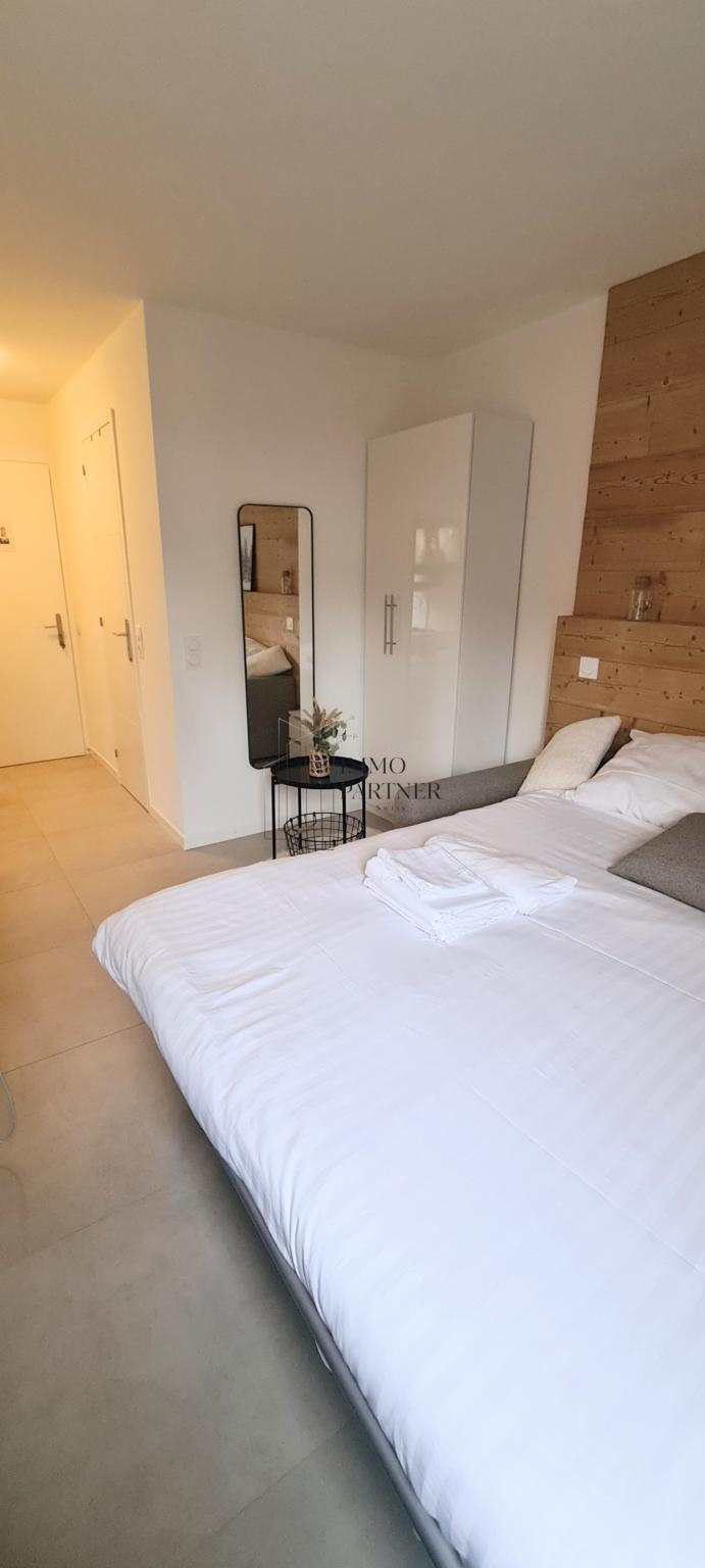 L’espace comprend un coin nuit agréable, une cuisine équipée ainsi qu’un petit coin repas.